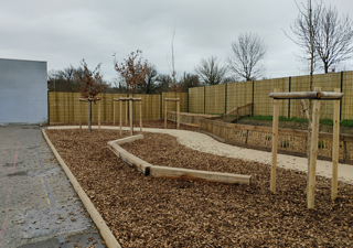 Création de la zone en copeaux de près de 140 m² avec espace pour faire classe dehors mais aussi espace pour jouer avec les copeaux et marcher sur les poutres en toute sécurité.
