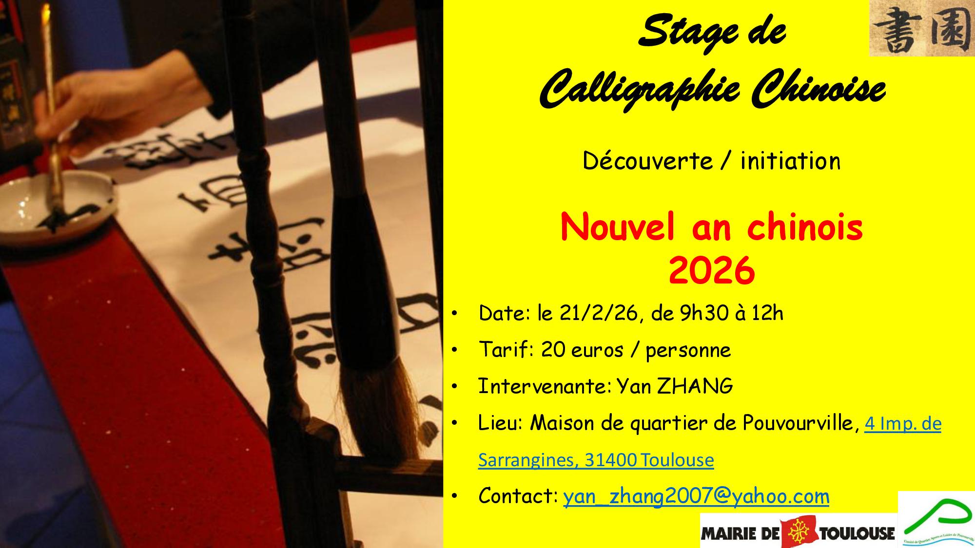 A l’occasion du nouvel an chinois, Yan ZHANG propose un stage de calligraphie chinoise aux adhérents du CQSLP le samedi 21 février de 9h30 à 12h à la maison de quartier de Pouvourville.